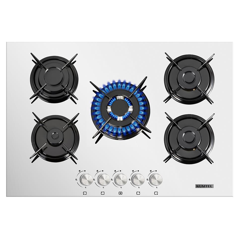 • Beyaz cam yüzey • 5 Gözü Gazlı (1 gözü Tribıl Woklu) • 75 cm. genişlik • Otomatik düğmeden ateşleme • Gaz sönme emniyeti • Bulaşık makinesinde yıkanabilir emaye ızgaralar